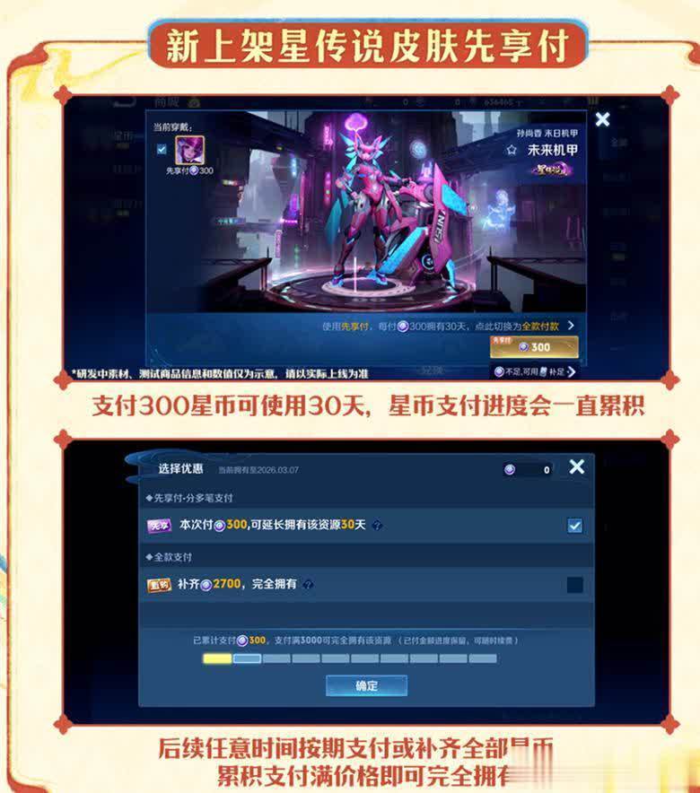 此前不少玩家期盼皮肤能分期使用,如今皮肤分期功能已在体验服上线测试,不过目前仅限于星币皮肤。很多玩家星币不足却想用星传说或星史诗皮肤,而皮肤分期功能提供了先享用皮肤再支付星币的方式,当然还是要先付一些星币,且所花星币与使用天数成正比,即要先首付,之后慢慢还,等星币总消费数等于星皮肤价格时就能拥有该皮肤。